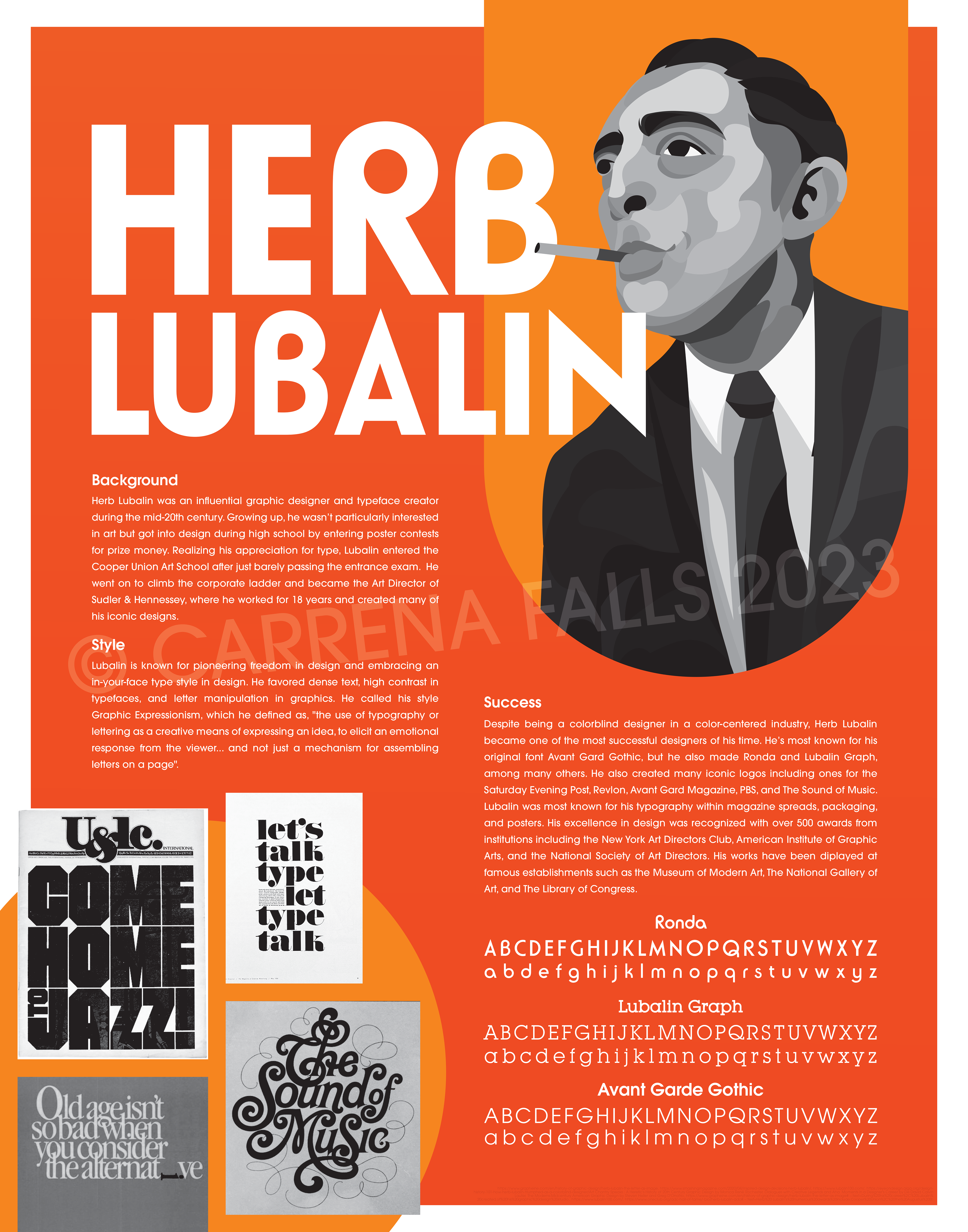 I composed and designed this poster about typographer Herb Lubalin as a personal project. 22x28in, full color. Formatted for professional print production.